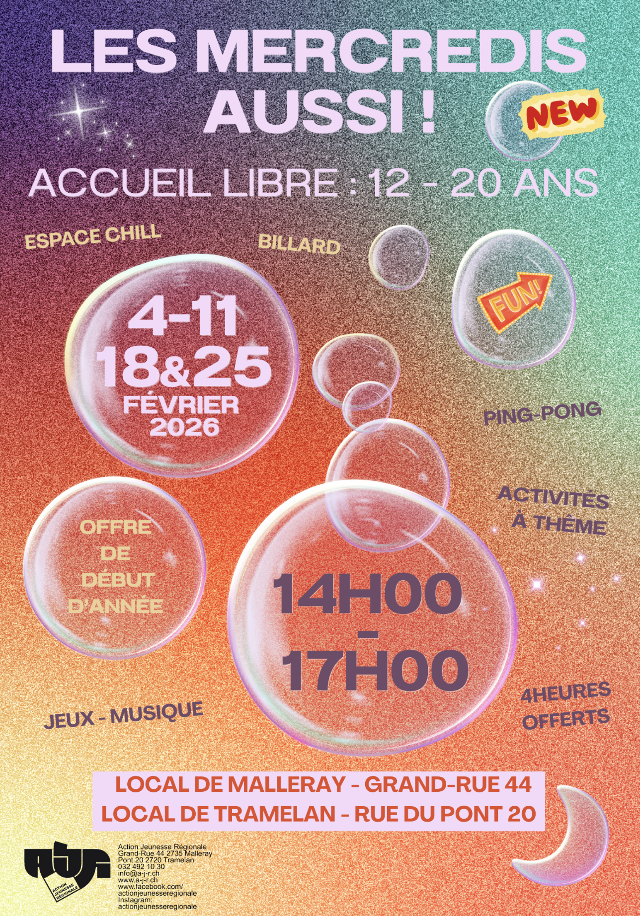 Mercredi 18 février 2026 Les Mercredis aussi ! A Malleray et à Tramelan Jeudi 19 février 2026 Bienvenue à l'AJR, les locaux sont ouverts... Vendredi 20 février 2026 Bienvenue à l'AJR, les locaux sont ouverts...